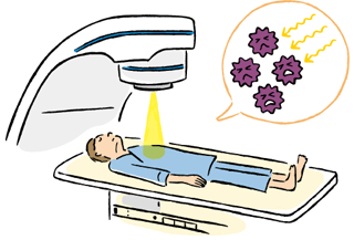 一般的には、患部全体に放射線を当てることで、がん細胞のDNAを損傷させて増殖を阻害します。